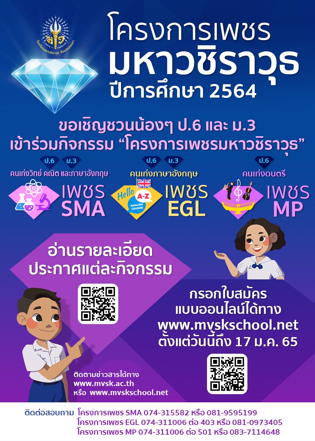 ประกาศ เรื่อง ให้ทุนการศึกษาสำหรับนักเรียนที่ผ่านการคัดเลือกโครงการเพชรมหาวชิราวุธ SMA, เพชร EGL (EGL Fly High) และ เพชร MP ชั้นมัธยมศึกษาปีที่ 1 และ 4 ประจำปี 2565 อ่านประกาศที่นี่