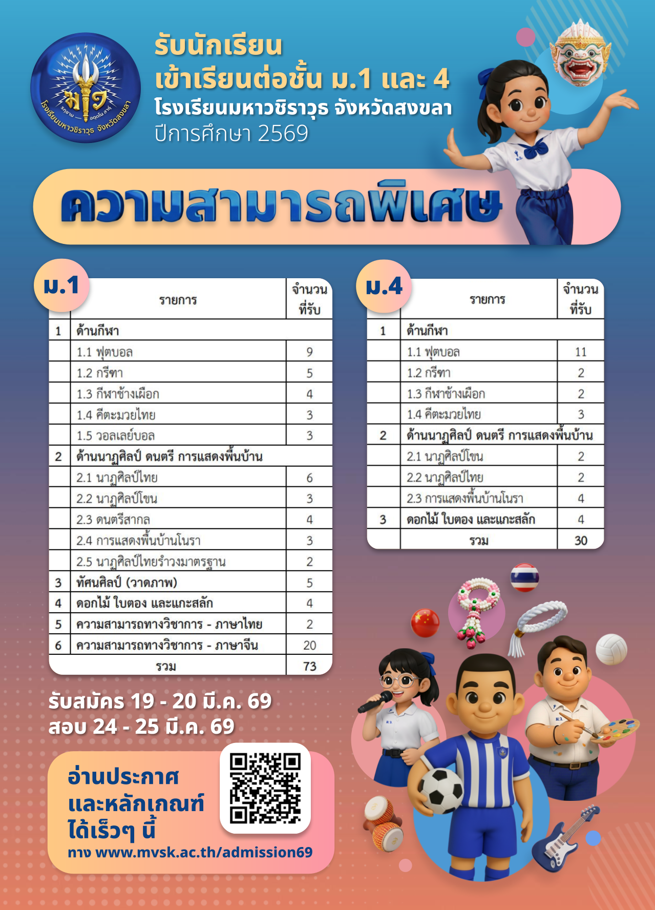 ประกาศ เรื่อง รายชื่อนักเรียนที่ผ่านการคัดเลือกเข้าศึกษาต่อชั้นมัธยมศึกษาปีที่ 1 และ 4 ห้องเรียนพิเศษ โรงเรียนมหาวชิราวุธ จังหวัดสงขลา ปีการศึกษา 2569