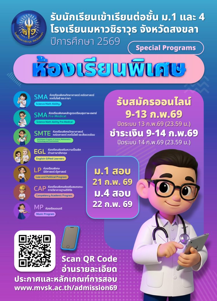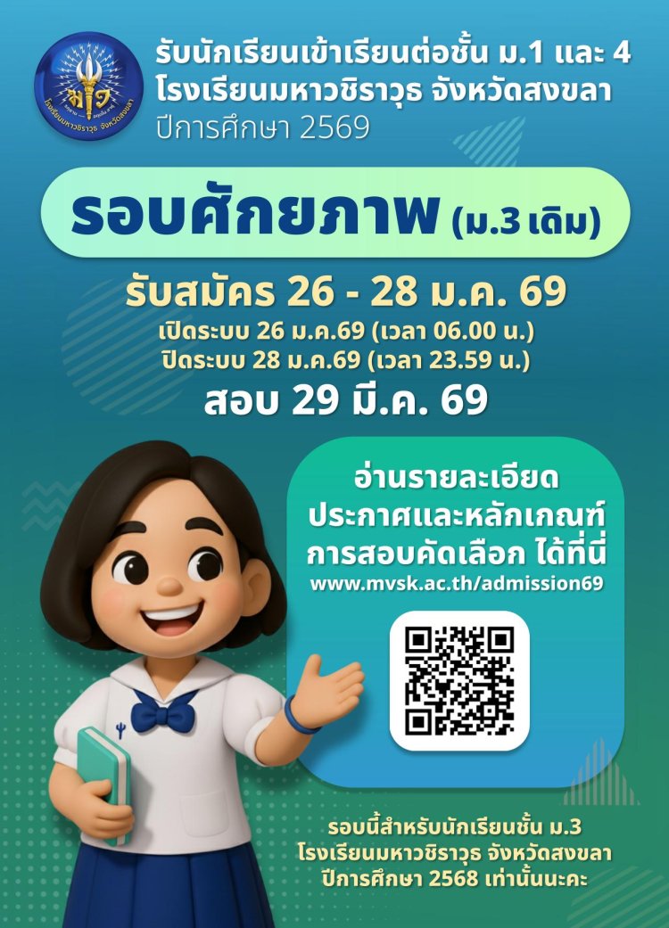 ประกาศ เรื่อง การรับนักเรียนเข้าศึกษาต่อชั้นมัธยมศึกษาปีที่ 1 ห้องเรียนพิเศษ โรงเรียนมหาวชิราวุธ จังหวัดสงขลา ปีการศึกษา 2569