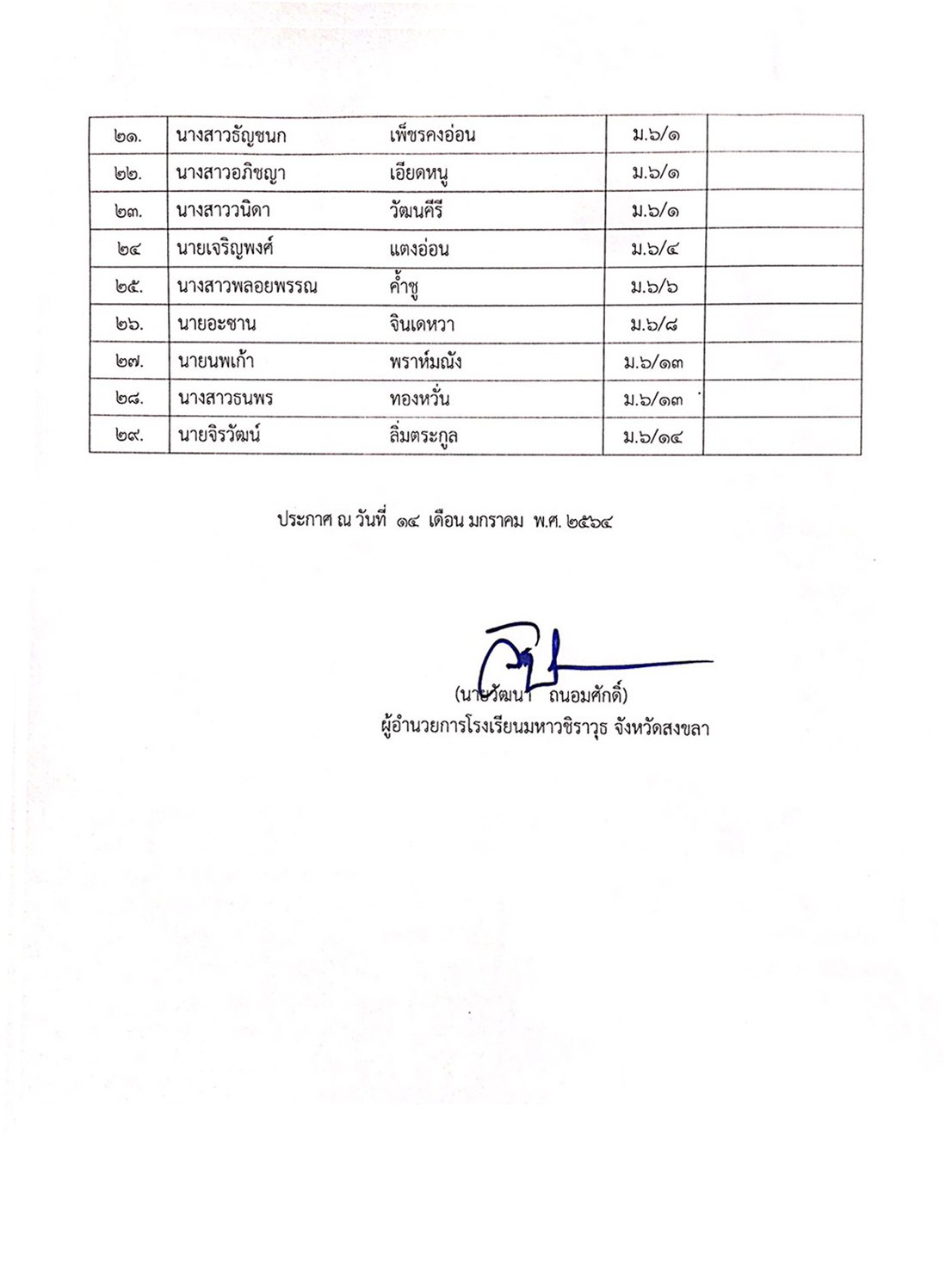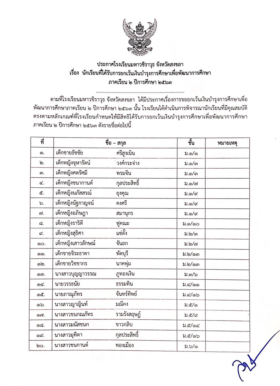 ประกาศโรงเรียนมหาวชิราวุธ จังหวัดสงขลา เรื่อง นักเรียนที่ได้รับการยกเว้นเงินบำรุงการศึกษาเพื่อพัฒนาการศึกษา ภาคเรียนที่ 2 ปีการศึกษา 2563