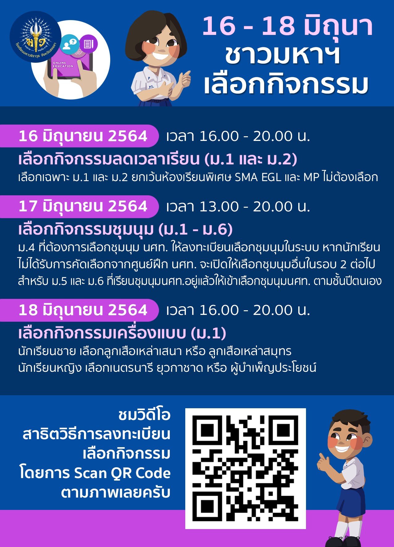 18 มิถุนายน 2564 เลือกกิจกรรมเครื่องแบบ (ม.1) เวลา 16.00 - 20.00 น.