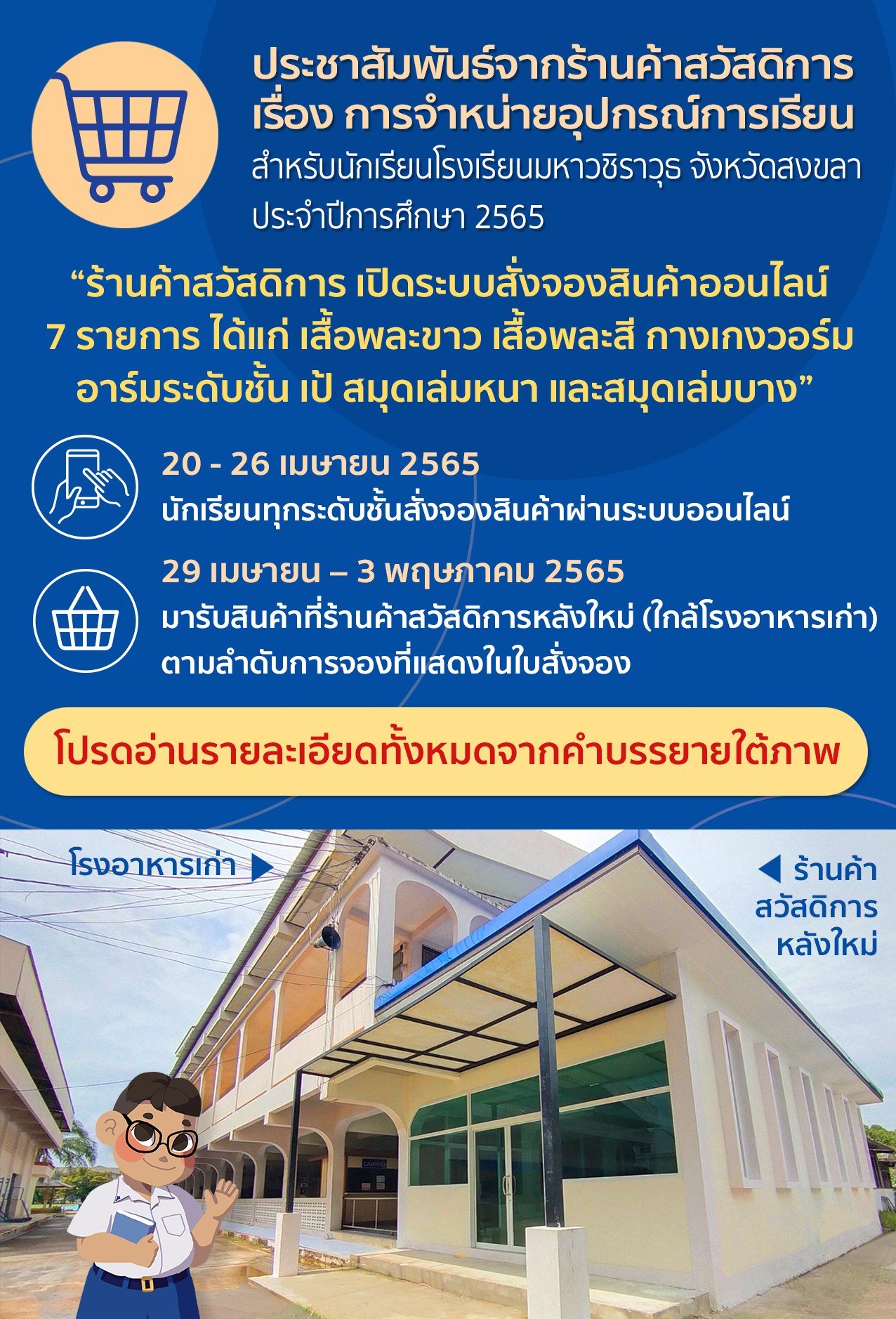 ประชาสัมพันธ์จากร้านค้าสวัสดิการ เรื่อง การจำหน่ายอุปกรณ์การเรียน สำหรับนักเรียนโรงเรียนมหาวชิราวุธ จังหวัดสงขลา ประจำปีการศึกษา 2565