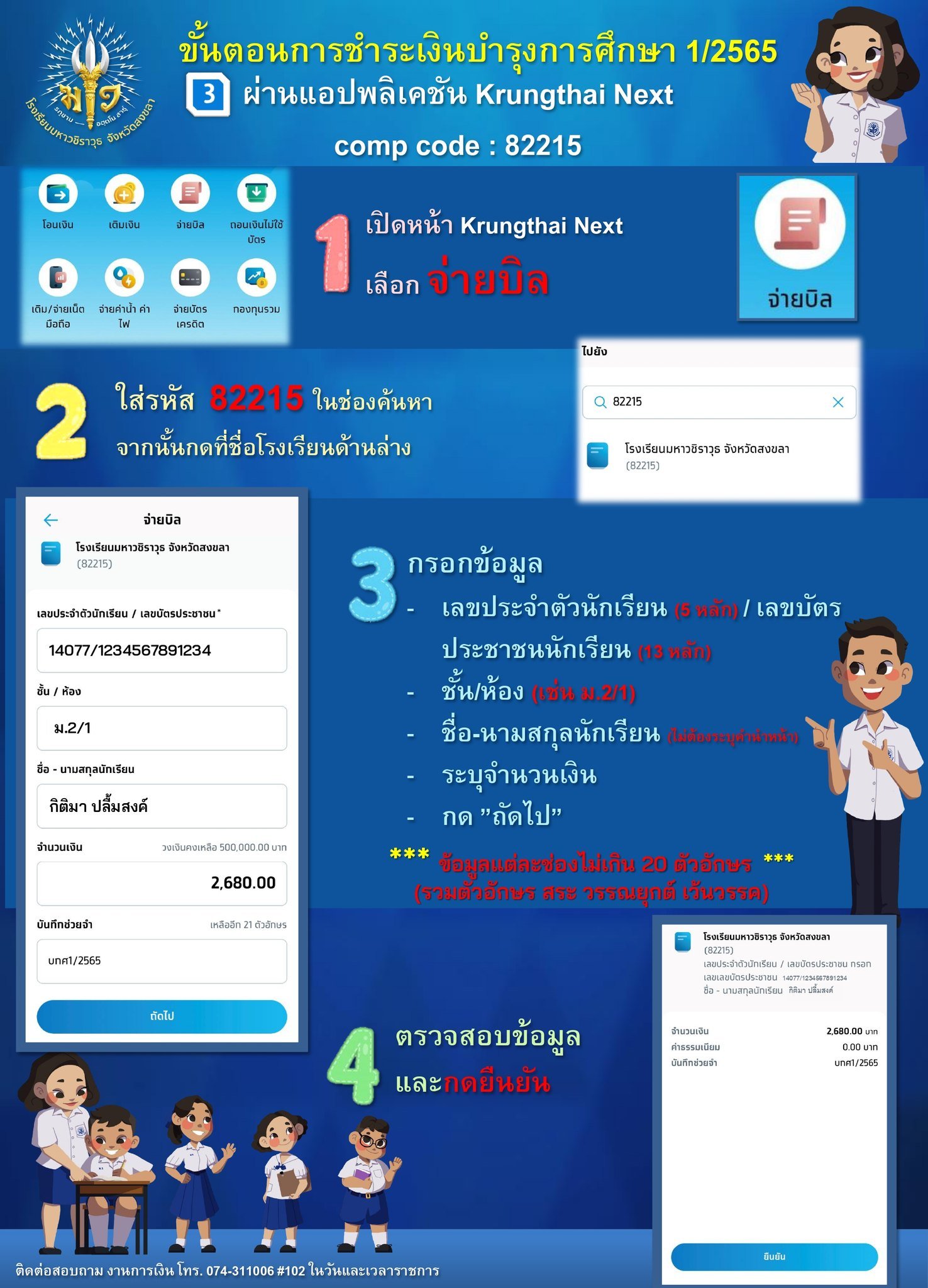 1. ผู้ปกครองสามารถรับใบเสร็จรับเงินได้ที่ห้องการเงิน โรงเรียนมหาวชิราวุธ จังหวัดสงขลา หลังชำระเงิน 3 วันทำการ
