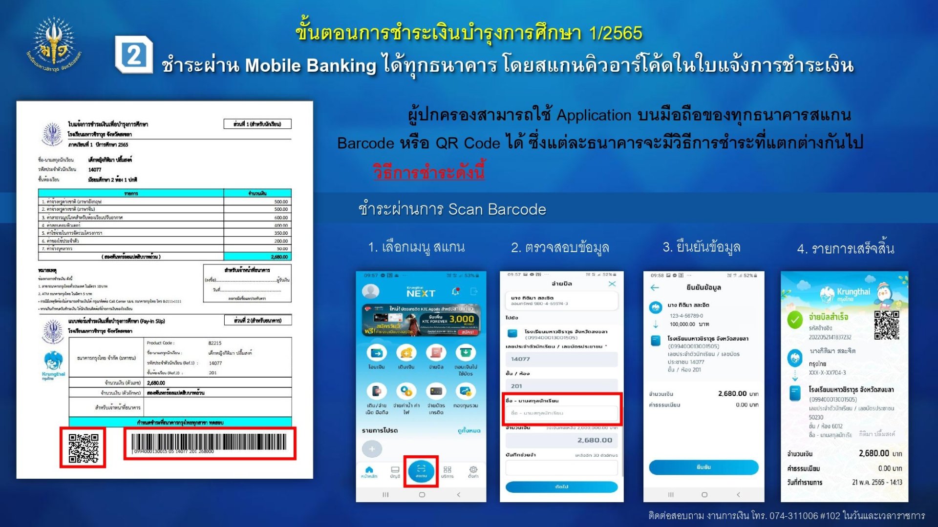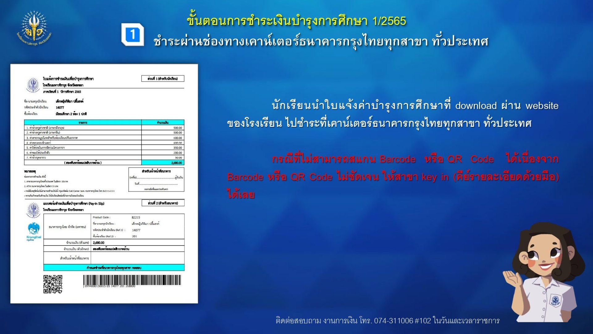 แจ้งการชำระเงินค่าบำรุงการศึกษา ภาคเรียนที่ 1 ปีการศึกษา 2565