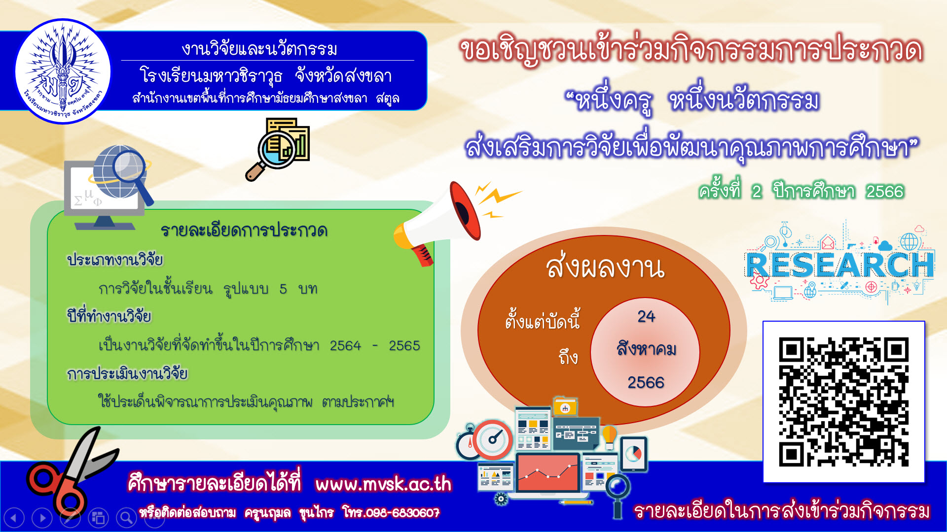 ขอเชิญชวนเข้าร่วมประกวดผลงานการวิจัยเข้ารับการคัดสรรรางวัล กิจกรรม "หนึ่งครู หนึ่งนวัตกรรม ส่งเสริมการวิจัย เพื่อพัฒนาคุณภาพการศึกษา" ครั้งที่ 2 ประจำปีการศึกษา 2566