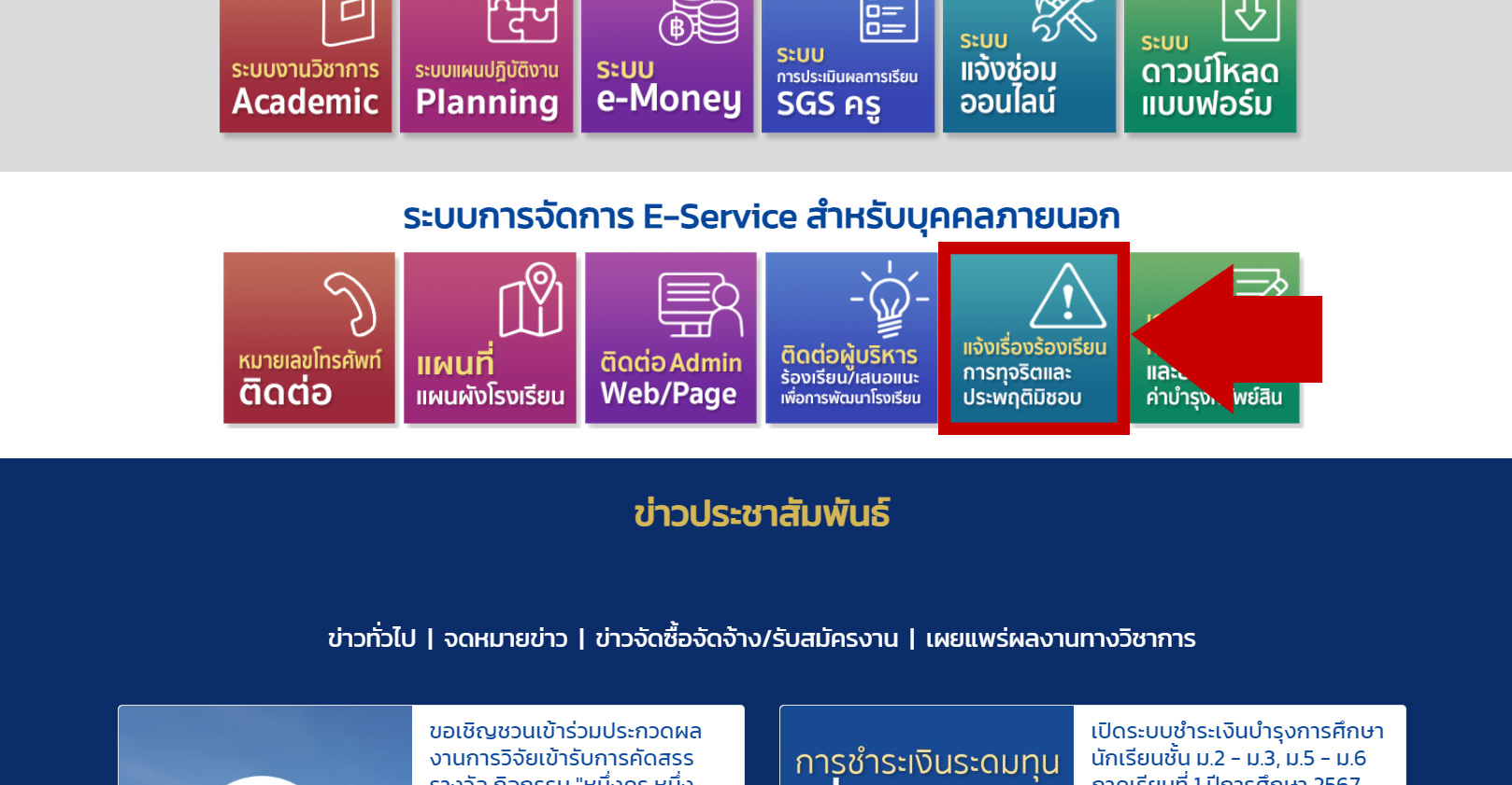 บุคคลภายนอกสามารถแจ้งเรื่องร้องเรียนการทุจริตและประพฤติมิชอบได้โดยกดเลือกเมนูตามภาพ